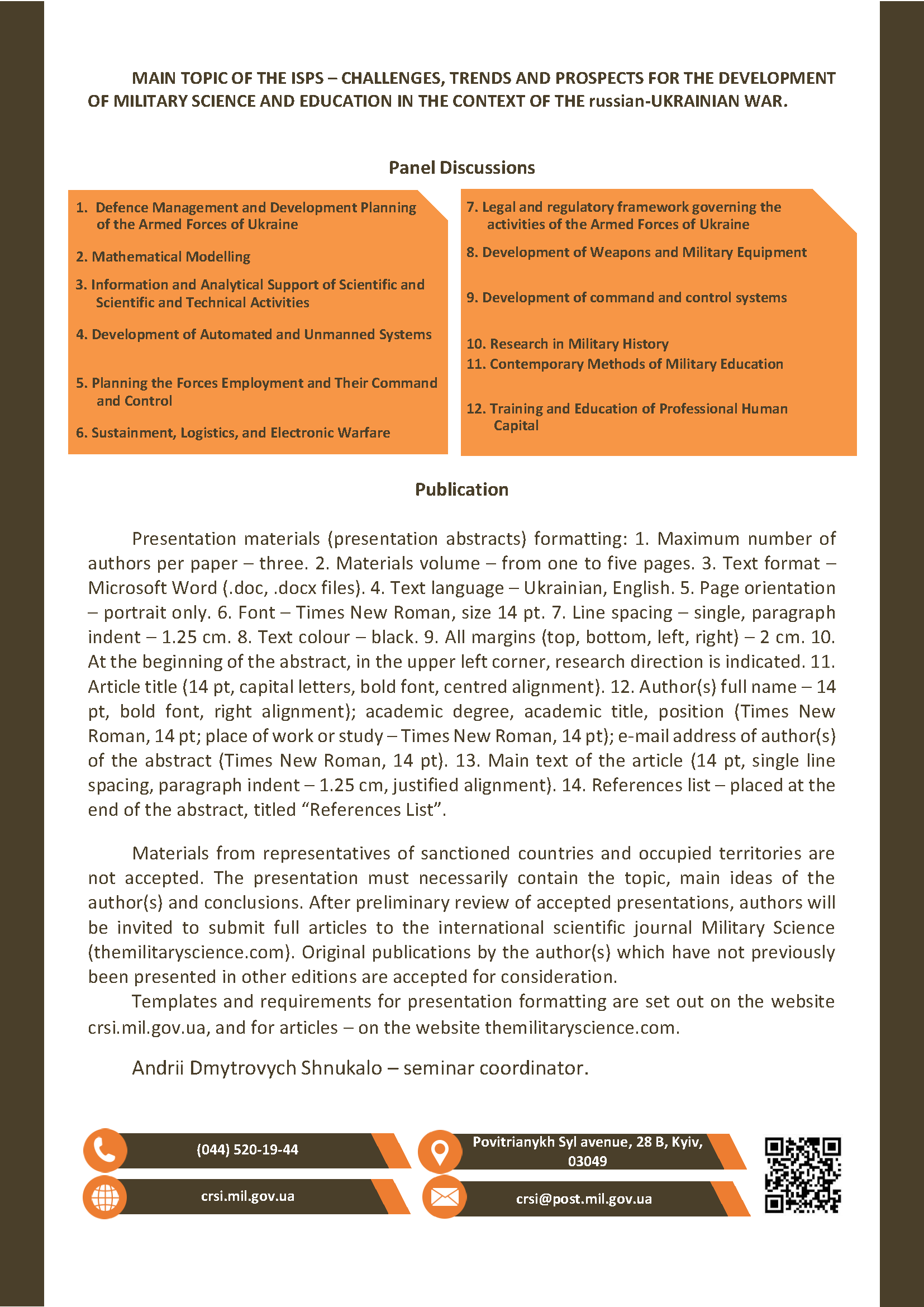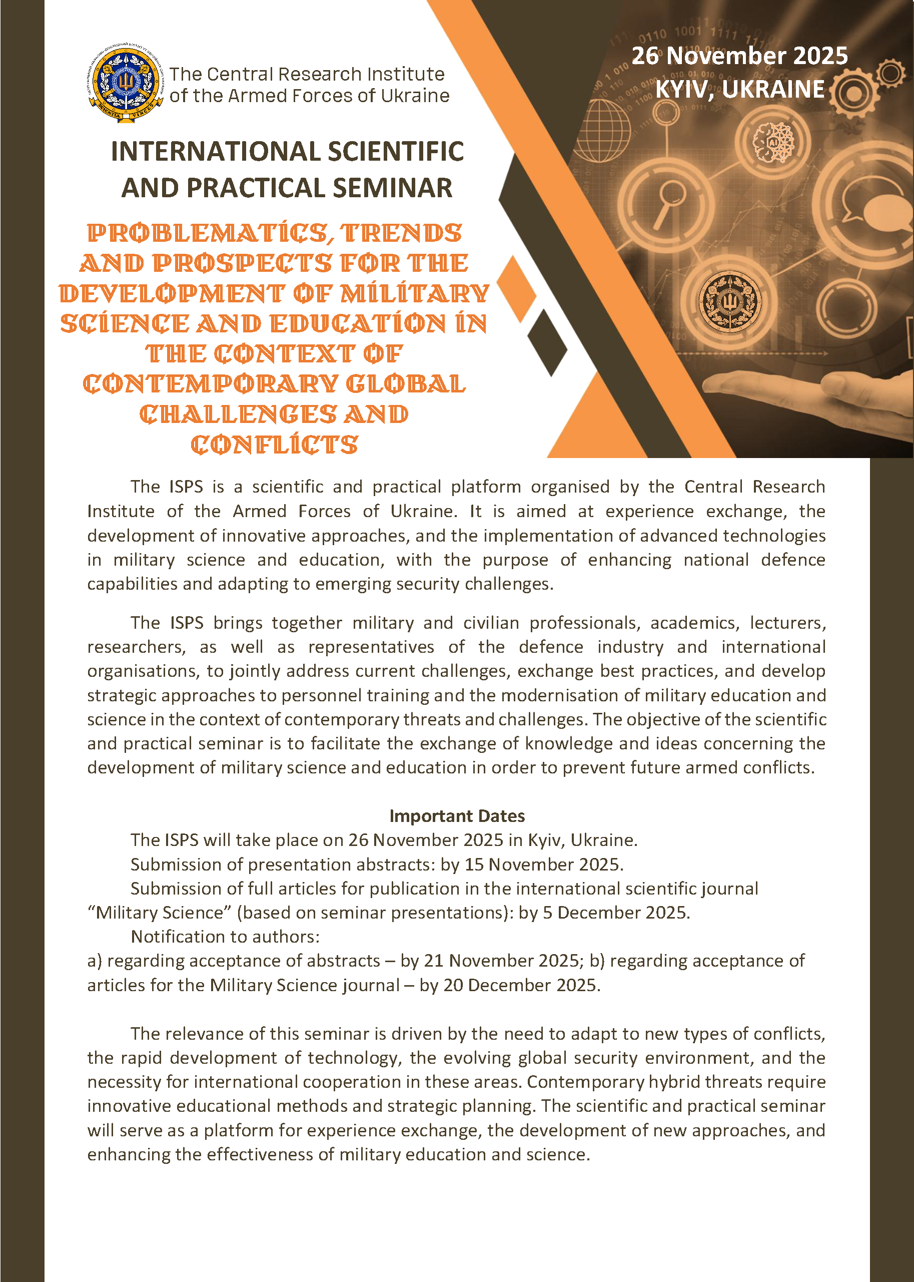 The collection contains abstracts from the International Scientific and Practical Seminar, which highlight the promlematics, trends and prospects for the development of military science and education in the context of contemporary global challenges and conflicts, according to the following panels: defence management and planning of the development of the Armed Forces of Ukraine, mathematical modelling, information and analytical support for scientific and scientific-technical activities, development of automated and unmanned systems, planning and management of the use of troops (forces), support, logistical support and electronic warfare, regulatory and legal regulation of the activities of the Armed Forces of Ukraine, development of weapons and military equipment, development of command and control systems, modern methods of military education, training and education of professional human capital.